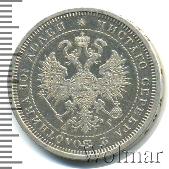 Аверс: по кругу вдоль края монеты надпись, разделенная вверху розеткой, «ЧИСТОГО СЕРЕБРА 2 ЗОЛОТНИКА 10 1/2 ДОЛЕЙ» в середине в точечном ободке Малый Государственный Герб Российской империи, внизу вдоль ободка слева и справа от хвоста орла инициалы минцмейстера «АГ» (Аполлон Грасгоф).