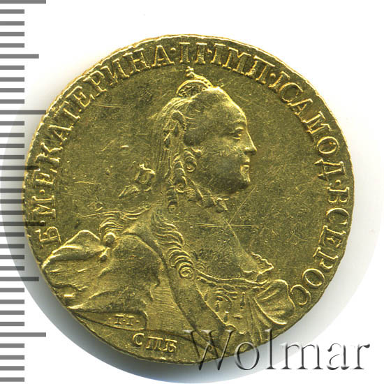 Аверс: в центре портрет Императрицы Екатерины II, обращенный вправо, под ним обозначение Санкт-Петербургского монетного двора «СПБ» , вверху слева направо вдоль края надпись «Б.М.ЕКАТЕРИНА.II.ИМП.ИСАМОД.ВСЕРОС» (Божьей милостью Екатерина II Императрица и Самодержица Всероссийская).