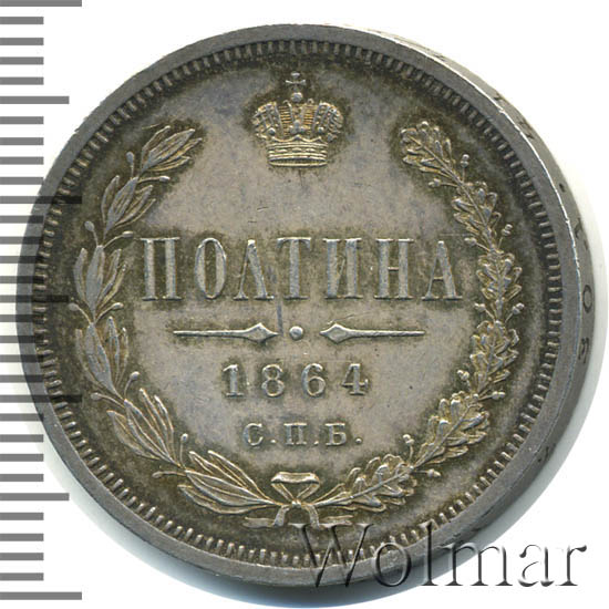 Реверс: вверху монеты корона Российской империи, ниже обозначение номинала «ПОЛТИНА», по ним две направленные в разные стороны фигурные черты, ниже год выпуска монеты «1864» и под ним обозначение монетного двора «СПБ». Слева вдоль края монеты лавровая ветвь, справа дубовая, внизу ветви соединяются и перевязаны лентой.