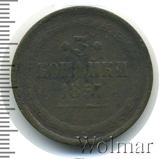 Реверс: вдоль края монеты венок вверху, внизу, слева и справа крестообразно перехваченный лентами, внутри венка вверху обрамленный слева и справа цветочными розетками номинал монеты цифра «3», ниже слово «КОПЕЙКИ», под ним год выпуска монеты «1857.», ниже две смотрящие в разные стороны фигурные черты и под ними обозначение монетного двора «ВМ».