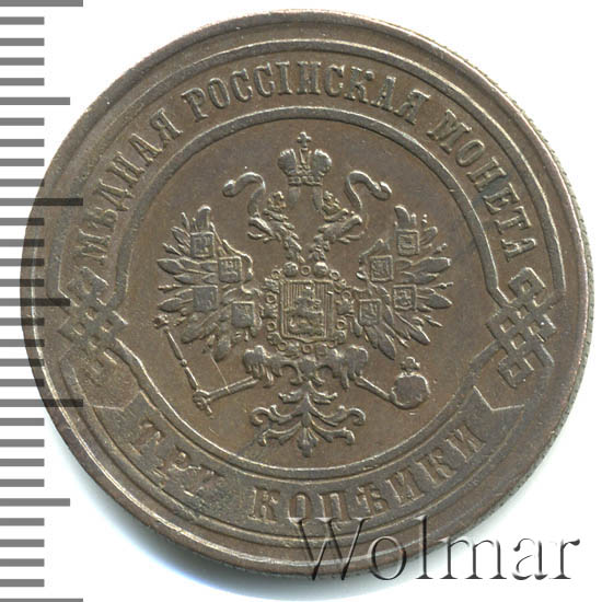 Аверс: вверху вдоль края монеты в выделенной выступающей рамкой полосе надпись «МЕДНАЯ РОССИЙСКАЯ МОНЕТА», внизу вдоль края монеты в выступающей рамке, соединённой с верхней рамкой расположенными слева и справа фигурными решетками, на выступающей плашке вдавленными буквами обозначение номинала монеты «ТРИ КОПЕЙКИ», в середине Малый Государственный Герб Российской империи.
