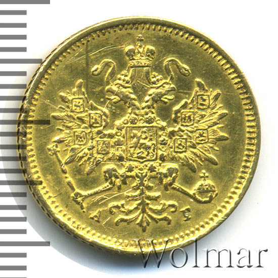 Реверс: по кругу вдоль края монеты надпись, разделенная вверху розеткой, «ЧИСТОГО ЗОЛОТА 81 ДОЛЯ», в середине в точечном ободке сверху обозначение номинала монеты цифра «3», слева и справа от нее звездочки, ниже слово «РУБЛЯ», под ним две смотрящие в разные стороны черты, разделенные точкой, ниже год выпуска монеты «1884» и внизу у точечного ободка обозначение Санкт-Петербургского монетного двора «СПБ».