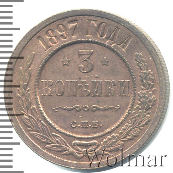 Реверс: вверху вдоль края монеты обозначение год выпуска «1897 ГОДА» ниже слева вдоль края монеты лавровая ветвь, справа дубовая, внизу ветви соединяются и перевязаны лентой, в середине в ободке из точек обрамленный слева и справа звездочками номинал монеты - цифра «3», ниже слово «КОПЕЕК», под ним две направленные в разные стороны фигурные черты, ниже обозначение монетного двора «СПБ».